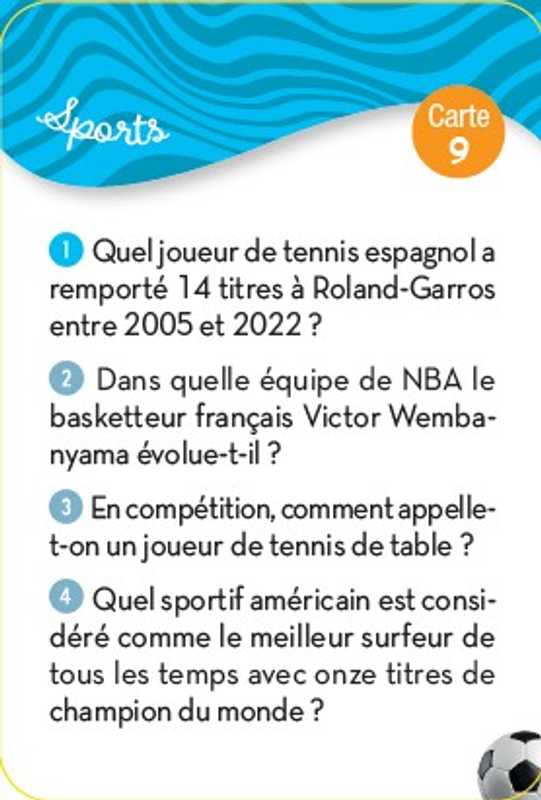 - 10 cartes « Sports » (ex : « Quel footballeur britannique est surnommé "le 5e Beatles ?" »)