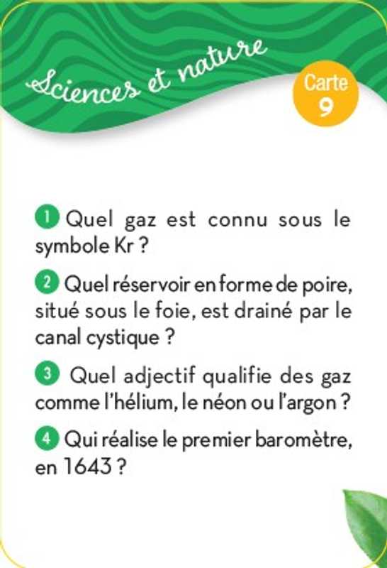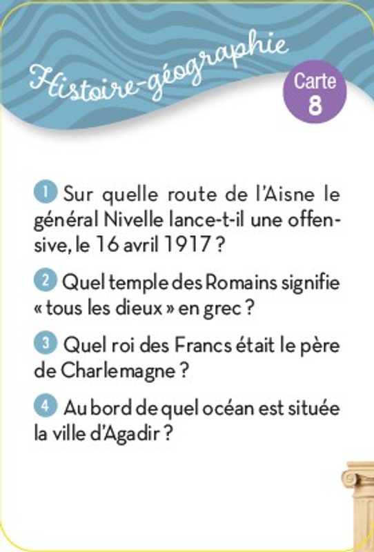 - 10 cartes « Gastronomie » (ex : « En Belgique, quelle matière grasse utilise-t-on pour cuire les frites ? »).