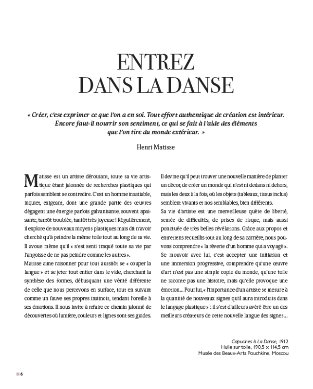 L’Atelier rouge, la Danse, la Musique, La Femme au chapeau, la Joie de vivre… les œuvres d’Henri Matisse utilisent à l’envi couleurs pures, aplats, formes mémorables caractéristiques d’un art enjoué et épuré qui laisse s’exprimer toutes les nuances de la palette.