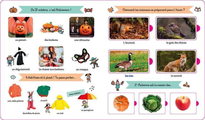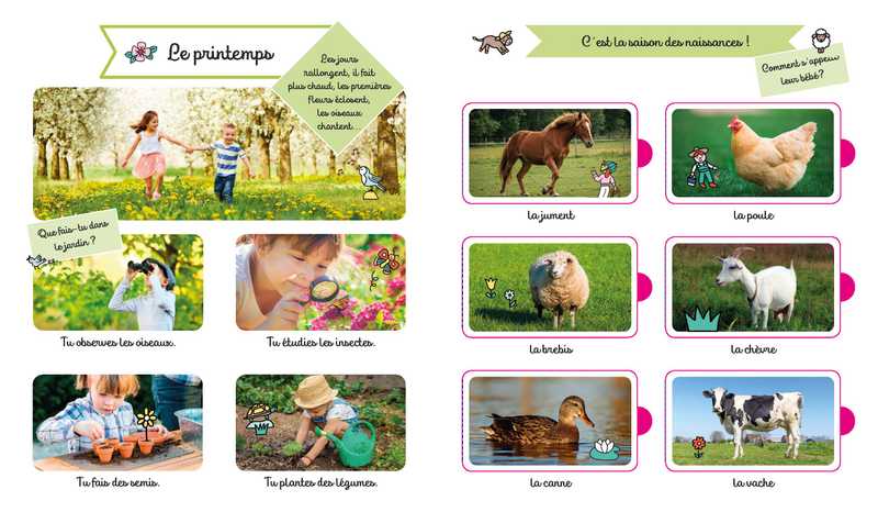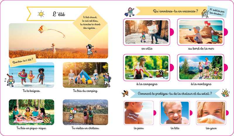 Cet imagier animé éveille la curiosité des tout-petits et développe leur vocabulaire en les guidant à travers les saisons : les transformations de la nature, les fruits et légumes de chaque période, les vêtements adaptés, les animaux et activités spécifiques à chaque saison…