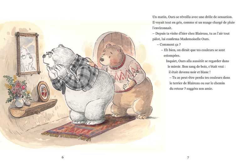 Un matin, Ours se réveille différent. Ses couleurs ont disparu.