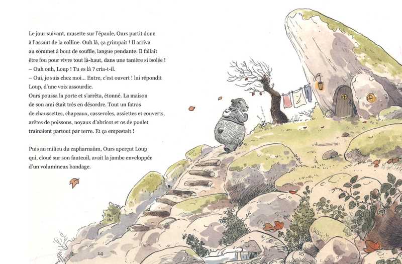 Autour de lui, le monde reste éclatant : le ciel est bleu, le soleil orange, les fleurs jaunes et lilas… mais lui est devenu gris. Gris comme la pluie. Inquiet et un peu triste, Ours décide d'aller rendre visite à son ami Loup qui s'est cassé la patte. Il découvrira alors qu'aider les autres peut parfois aider à se retrouver soi-même. Il suffit parfois d’ouvrir son cœur pour que le monde retrouve ses couleurs.