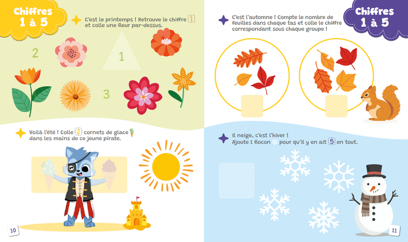 Avec ce joli cahier plein de couleurs, pars à la rencontre des chiffres ! Sur chaque page, colle les autocollants au bon endroit et réalise de petites activités ludiques pour reconnaître et apprendre les chiffres. Un premier pas tout en douceur vers le calcul, spécialement conçu pour les petites mains curieuses !