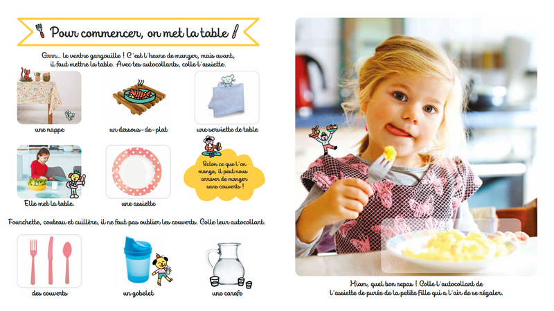 Apprends tout sur les aliments et les repas dans ce bel imagier photos : les fruits et légumes, les ustensiles, les plats…