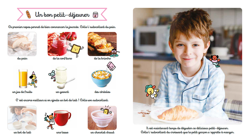 Amuse-toi à coller une tartine sur la table du petit-déjeuner, une fourchette à côté de l’assiette ou encore une pomme dans un panier !