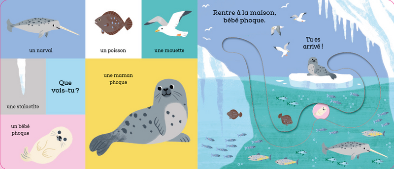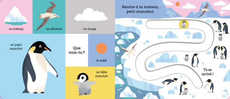 L’enfant doit aider bébé manchot, bébé renne, bébé ours et bébé phoque à rentrer à la maison. Il peut suivre le chemin avec son doigt grâce à un système de pastille à déplacer.